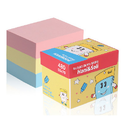 | 기타사항 | •53 x 73 x 53mm •내지 50 x 70mm, 총480매 •분홍, 노랑, 하늘색 (색상별160매) •박스 컬러인쇄, 내지 먹1도 •기본수량 100개 |